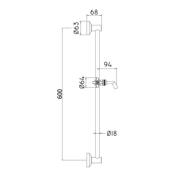 Гарнитур оснащен душевой штангой диаметром Ø18 мм и высотой 620 мм, что обеспечивает комфортное размещение в душе. Расстояние между осями крепления — 600 мм, что делает установку максимально простой и совместимой с большинством стандартных душевых зон.