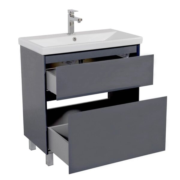 Компания Aqua Rodos заслуженно считается одним из ведущих производителей эксклюзивной и качественной сантехники в Украине. Много лет бренд успешно развивается и завоевывает рынок в данном сегменте на всей территории СНГ, ассоциируясь с высоким качеством, стильным дизайном и долговечной надежностью.Компания использует самое современное оборудование и сертифицированные материалы от лучших мировых производителей, создавая экологичную продукцию. Тумба AQUA RODOS Элит с умывальником CeraStyle Elite 80 см в цвете графит глянец — это мебель в современном дизайне, которая придаст интерьеру стильный и эффектный вид.Фасад и боковины тумбы покрыты тремя слоями грунтовки и окрашены двумя слоями глянцевой полиуретановой краски производства «KEMICHAL» (Италия). Ширина умывальника составляет 80 см, материал — керамика, производитель — CeraStyle (Турция).Корпус и фасад выполнены из МДФ, модель имеет напольный монтаж. Коллекция носит название Элит, а фурнитура представлена брендами Blum и Hettich. Цвет изделия — графит. Габариты тумбы: 80 см в ширину, 85 см в высоту и 45 см в глубину.