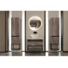 Умывальник приобретается к тумбе отдельно. Модель Iron изготовлена из ДСП в цветах севилья и дуб морас. Тумба может быть оснащена столешницей (фанера в акриловой краске) под накладной умывальник или керамическим умывальником Arte. В конструкции есть металлические элементы, такие как нижний каркас и металлическая ручка. Покраска элементов производится на базе компании Аква Родос. Металл окрашен в черный цвет с использованием экологичной порошковой краски, не содержащей вредных компонентов. Выдвижной шкаф оснащен направляющим с медленным закрыванием. Материал корпуса — ДСП, материал фасада — МДФ. Глубина составляет 450 мм, ширина умывальника — со столешницей, умывальник — накладной. Фурнитура от Hettich, цвет изделия — дуб морас. Габариты составляют 75*85*45 см.