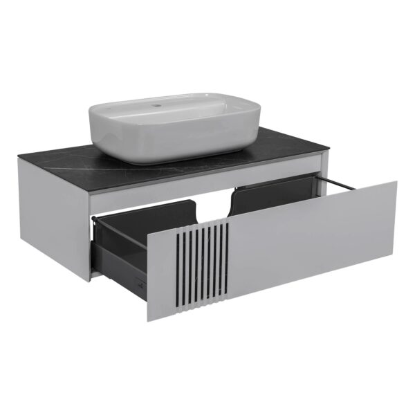 Корпус и фасады покрыты тремя слоями грунта и пятью слоями премиальной краски производства «KEMICHAL», что защищает мебель от воздействия влаги и сохраняет ее цвет на протяжении всего срока службы. Подвесная конструкция выглядит элегантно и требует меньше времени для уборки. Интегрированные в фасад фрезерованные ручки обеспечивают удобство использования. Фурнитура TANDEMBOX от BLUM (Австрия) с доводчиком гарантирует плавную работу.