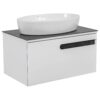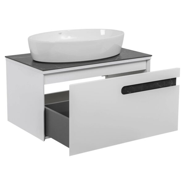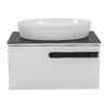 Мебель Остин — это современный европейский дизайн в стиле модерн. Мебель оснащена декоративной столешницей из керамогранита, изготовленного из искусственного материала с отделкой под серый мрамор. Керамогранит обладает низким коэффициентом водопоглощения благодаря своей текстуре и низкой пористости.Тумба комплектуется керамическим умывальником, устанавливаемым под столешницу.Обратите внимание, что столешница не имеет отверстия под смеситель.Корпус и фасады покрыты тремя слоями грунта и пятью слоями премиальной краски производства KEMICHAL, что обеспечивает защиту от влаги и сохраняет первоначальный цвет мебели на протяжении всего срока службы. Подвесная конструкция мебели выглядит стильно и облегчает уборку.Интегрированные фрезерованные ручки максимально удобны.Фурнитура: выдвижная система BLUM (Австрия) с доводчиком. Материал фасада — МДФ. Бренд — AquaRodos. Ширина умывальника — 80 см. Материал раковины — керамика. Производитель умывальника — CeraStyle (Турция). Столешница — керамогранит 9 мм, цвет Namibia black. Глубина — 425 мм. Габариты — 80*71*42,5 см.