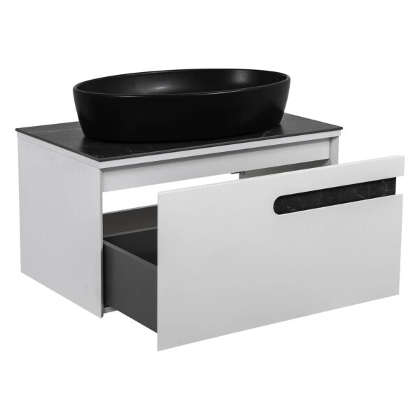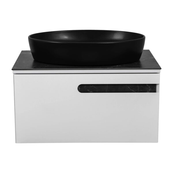 Мебель Остин — это современный европейский дизайн в стиле модерн. Мебель оснащена декоративной столешницей из керамогранита, изготовленного из искусственного материала с отделкой под серый мрамор. Керамогранит обладает низким коэффициентом водопоглощения благодаря своей текстуре и низкой пористости.Тумба комплектуется керамическим умывальником на выбор для установки под столешницу.Обратите внимание, что столешница не имеет отверстия под смеситель.Корпус и фасады покрыты тремя слоями грунта и пятью слоями премиальной краски производства KEMICHAL, что обеспечивает защиту от влаги и сохраняет первоначальный цвет мебели на протяжении всего срока службы. Подвесная конструкция выглядит стильно и облегчает уборку.Интегрированные фрезерованные ручки удобны в использовании.Фурнитура: выдвижная система BLUM (Австрия) с доводчиком. Материал фасада — МДФ. Бренд — AquaRodos. Ширина умывальника — 80 см. Материал раковины — керамика. Столешница — керамогранит 9 мм. Глубина — 425 мм. Габариты — 80*71*42,5 см.