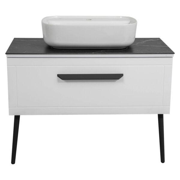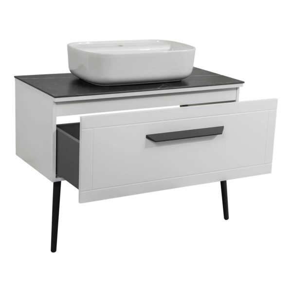 Мебель Сиена — это современный европейский дизайн в стиле модерн. Мебель комплектуется декоративной столешницей из керамогранита, который изготовлен из искусственного материала и покрыт декоративной отделкой из серого мрамора. Она обладает низким коэффициентом водопоглощения благодаря своей текстуре и низкой пористости. Тумба напольная с ножками нового дизайна комплектуется керамическим умывальником на выбор под столешницу. Обратите внимание, столешница не имеет отверстия под смеситель.Корпус и фасады покрыты тремя слоями грунта и окрашены пятью слоями премиальной краски производства «KEMICHAL», что защищает мебель от воздействия влаги и поддерживает первоначальный цвет продукта в течение всего срока службы. Подвесная конструкция выглядит эффектно и требует меньшего времени на уборку.Максимально удобные интегрированные в фасад фрезерованные ручки. Фурнитура: выдвижная система BLUM (Австрия) с доводчиком. Материал фасада — МДФ. Бренд — AquaRodos. Материал раковины — керамика. Вид — тумба. Производитель умывальника — CeraStyle (Турция). Ширина умывальника составляет 100 см. Цвет изделия — белый мат. Глубина — 400 мм. Умывальник — накладной. Описание: без отверстия под смеситель в столешнице (отверстие покупатель делает самостоятельно). Коллекция — Сиена. Материал столешницы — керамогранит 9 мм, цвет Namibia black. Габариты составляют 100*72,3*40 см.
