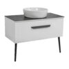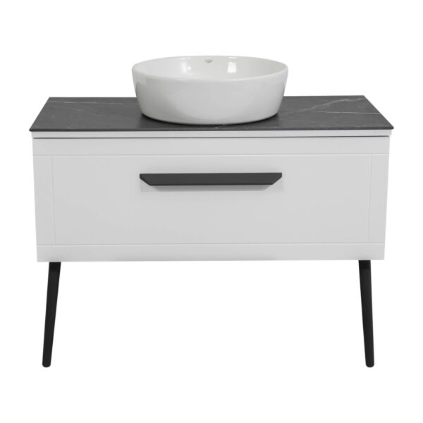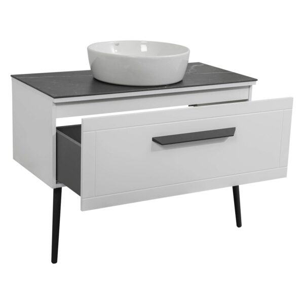 Мебель Сиена — это современный европейский дизайн в стиле модерн. Она комплектуется декоративной столешницей из керамогранита, сделанного из искусственного материала и покрытого декоративной отделкой из серого мрамора. Столешница обладает низким коэффициентом водопоглощения благодаря своей текстуре и низкой пористости.Напольная тумба с ножками нового дизайна комплектуется керамическим умывальником на выбор под столешницу. Обратите внимание, что столешница не имеет отверстия под смеситель.Корпус и фасады покрыты тремя слоями грунта и окрашены пятью слоями премиальной краски производства «KEMICHAL», что защищает мебель от воздействия влаги и поддерживает первоначальный цвет продукта на протяжении всего срока службы. Подвесная конструкция выглядит эффектно и требует меньше времени на уборку.Удобные интегрированные в фасад фрезерованные ручки добавляют практичности. Фурнитура включает выдвижную систему BLUM (Австрия) с доводчиком. Материал фасада — МДФ, а бренд — AquaRodos. Материал раковины — керамика. Тумба предусмотрена с умывальником от производителя CeraStyle (Турция). Ширина умывальника составляет 100 см. Цвет изделия — белый мат. Умывальник накладной. Описание: без отверстия под смеситель в столешнице (отверстие покупатель делает самостоятельно). Коллекция — Сиена. Материал столешницы — керамогранит 9 мм, цвет Namibia black. Габариты составляют 100*72,3*46 см.
