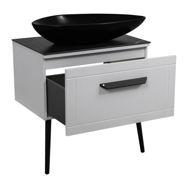 Мебель Сиена — это современный европейский дизайн в стиле модерн. Мебель комплектуется декоративной столешницей из керамогранита, изготовленного из искусственного материала и покрытого отделкой под серый мрамор. Она обладает низким коэффициентом водопоглощения благодаря текстуре и низкой пористости.Напольная тумба с ножками нового дизайна комплектуется керамическим умывальником, который устанавливается под столешницу. Обратите внимание, что столешница не имеет отверстия под смеситель.Корпус и фасады покрыты тремя слоями грунта и пятью слоями премиальной краски производства «KEMICHAL», что защищает мебель от влаги и сохраняет её первоначальный цвет на протяжении всего срока службы. Подвесная конструкция выглядит стильно и облегчает уборку.Удобные фрезерованные ручки интегрированы в фасад. Фурнитура — выдвижная система BLUM (Австрия) с доводчиком. Материал фасада — МДФ. Бренд — AquaRodos. Умывальник выполнен из керамики, его ширина — 70 см. Производитель умывальника — CeraStyle (Турция). Столешница — керамогранит толщиной 9 мм, цвет Namibia black. Габариты — 70*72,3*38,5 см.