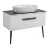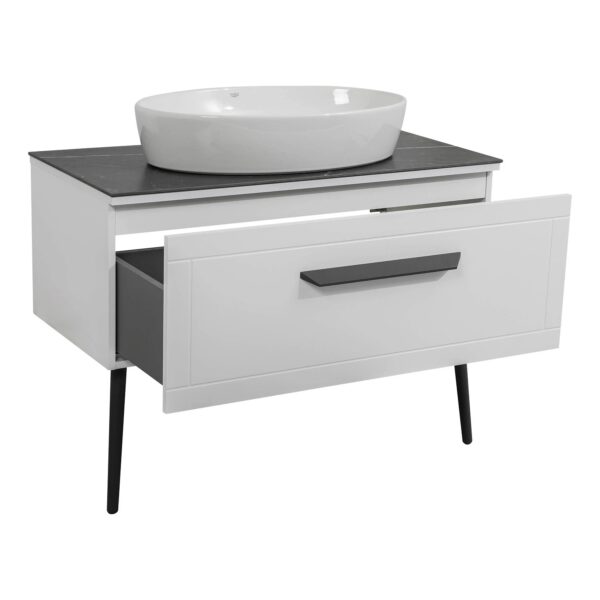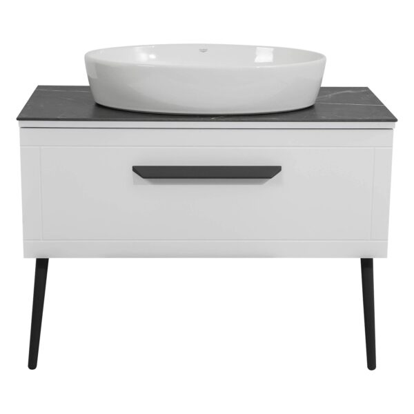 Мебель Сиена — это современный европейский дизайн в стиле модерн. Она комплектуется декоративной столешницей из керамогранита, который сделан из искусственного материала и покрыт декоративной отделкой из серого мрамора. Столешница обладает низким коэффициентом водопоглощения благодаря своей текстуре и низкой пористости.Напольная тумба с ножками нового дизайна комплектуется керамическим умывальником на выбор под столешницу. Обратите внимание, что столешница не имеет отверстия под смеситель.Корпус и фасады покрыты тремя слоями грунта и окрашены пятью слоями премиальной краски производства «KEMICHAL», что защищает мебель от воздействия влаги и поддерживает первоначальный цвет продукта на протяжении всего срока службы. Подвесная конструкция выглядит эффектно и требует меньше времени на уборку.Максимально удобные интегрированные в фасад фрезерованные ручки делают использование мебели более комфортным. Фурнитура включает выдвижную систему BLUM (Австрия) с доводчиком. Материал фасада — МДФ, а бренд — AquaRodos. Материал раковины — керамика, производитель умывальника — CeraStyle (Турция). Ширина умывальника составляет 100 см, а цвет изделия — белый мат. Умывальник — накладной, и описание: без отверстия под смеситель в столешнице (отверстие покупатель делает самостоятельно). Коллекция — Сиена, материал столешницы — керамогранит 9 мм, цвет Namibia black. Габариты составляют 100*72,3*42,5 см.