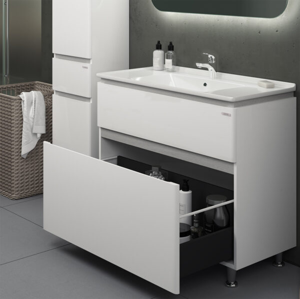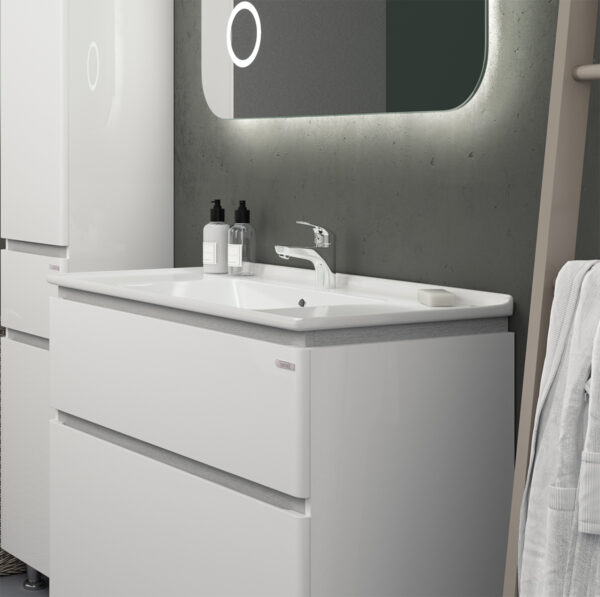У данной коллекции несколько ключевых отличий: первоклассный импортный керамический умывальник (Турция), внутреннее наполнение ящиков в цвете темно-серый графит, белые рейлинги, толстые фасады из 19мм МДФ, боковины МДФ, декоративная вставка RENOLIT (Германия) с имитацией крашенного шпона.