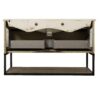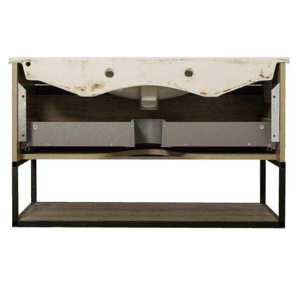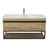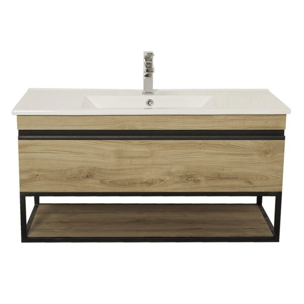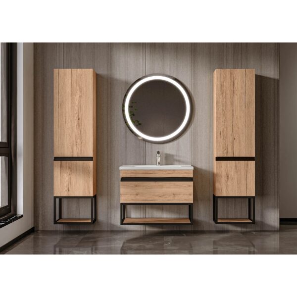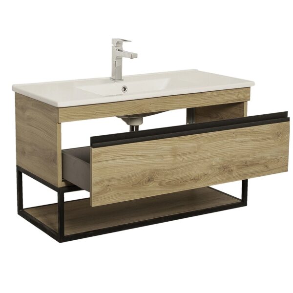 Модель Iron изготовлена из ДСП в цветах севилья и дуб морас. Тумба может быть оснащена столешницей для накладного умывальника или керамическим умывальником Arte. Доступные размеры модели: 65, 75, 85 и 100 см. В конструкции присутствуют металлические элементы, такие как нижний каркас и металлическая ручка. Все металлические части окрашиваются на производстве компании Aqua Rodos черной порошковой краской, которая является экологичной и не содержит вредных компонентов.