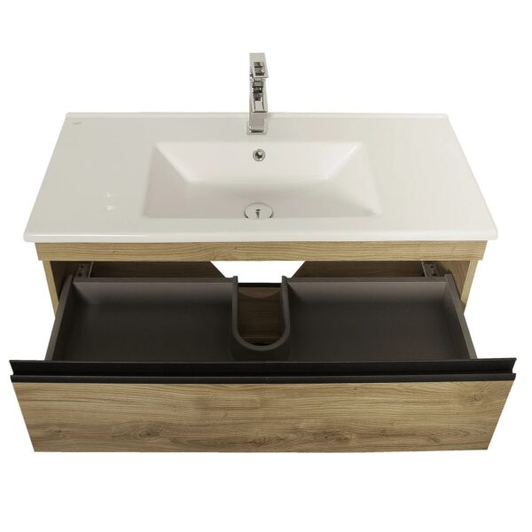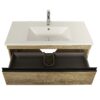 Тумба имеет гарантию 3 года. Корпус выполнен из ДСП, а фасад из МДФ. Умывальник, производства турецкой компании CeraStyle, выполнен из керамики. Ширина умывальника составляет 100 см. Модель имеет консольный монтаж, фурнитура от бренда Hettich. Тумба относится к коллекции «Лофт» и комплектуется умывальником серии Arte. Габариты изделия: 100 х 85 х 44,5 см.