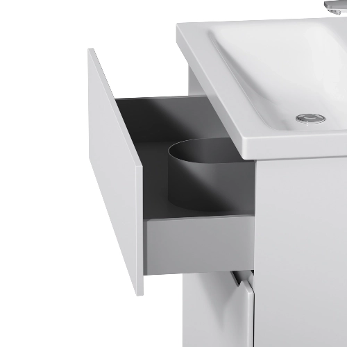 Интегрированные фрезерованные ручки в фасаде обеспечивают комфортное использование. Премиальные детали включают антискользящее покрытие ящиков и фурнитуру Hettich.