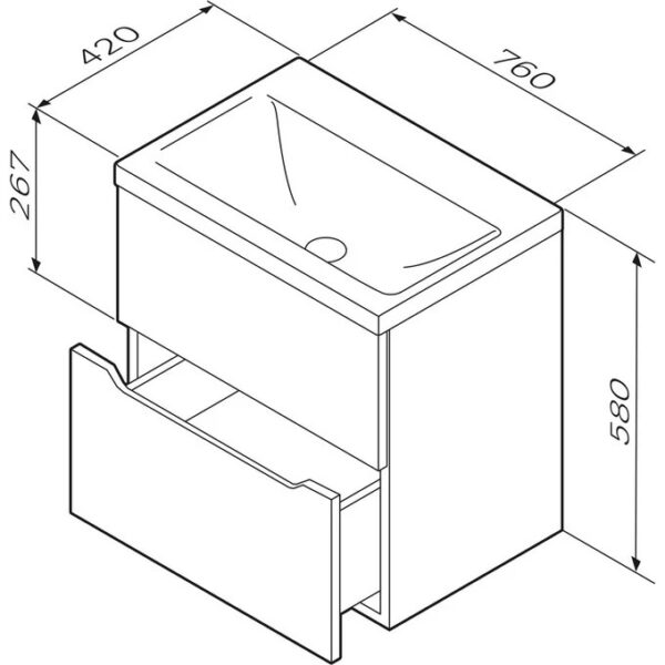 Массивная керамическая раковина толщиной 5 см с проекцией всего 42 см подходит даже для самых компактных ванных комнат. Изящные фрезерованные ручки, интегрированные в фасад, добавляют удобства в использовании.