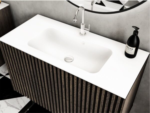 Умывальник DELLA 1000 из литого мрамора MIRAGGIO. Литой мрамор — твердый и долговечный материал. Основным компонентом смеси является молотая мраморная крошка, которую смешивают с полиэфирными смолами. Раковина покрывается антибактериальным гелем Gelcoat ISO NPG, который делает изделие прочным и белоснежным.