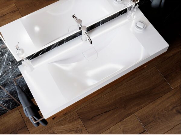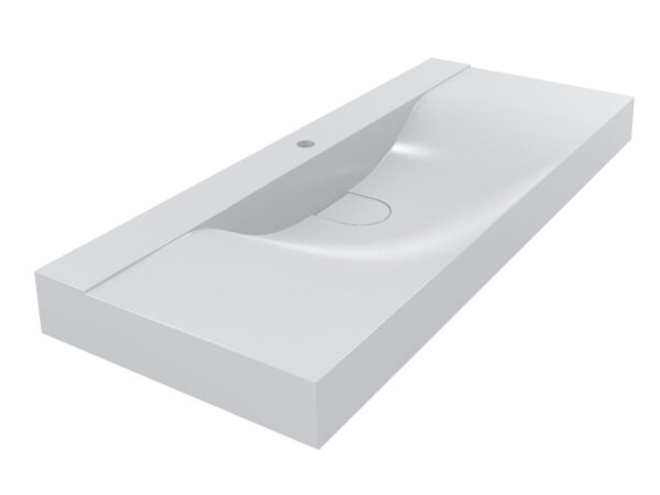 Умывальник FLY 1200 из литого мрамора MIRAGGIO. Литой мрамор — твердый и долговечный материал. Основным компонентом смеси является молотая мраморная крошка, которую смешивают с полиэфирными смолами. Раковина покрывается антибактериальным гелем Gelcoat ISO NPG, который делает изделие прочным и белоснежным.
