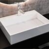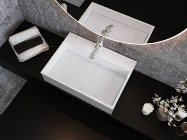 Умывальник MARES 600 из литого мрамора MIRAGGIO. Литой мрамор — твердый и долговечный материал. Основным компонентом смеси является молотая мраморная крошка, которую смешивают с полиэфирными смолами. Раковина покрывается антибактериальным гелем Gelcoat ISO NPG, который делает изделие прочным и белоснежным.