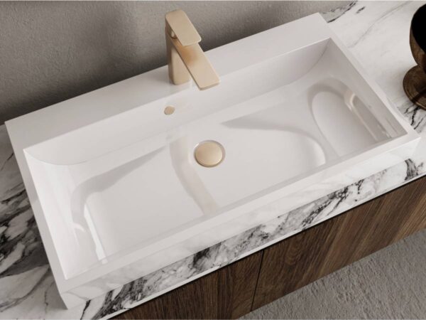 Умывальник VARNA 800 из литого мрамора MIRAGGIO. Литой мрамор — твердый и долговечный материал. Основным компонентом смеси является молотая мраморная крошка, которую смешивают с полиэфирными смолами. Раковина покрывается антибактериальным гелем Gelcoat ISO NPG, который делает изделие прочным и белоснежным.