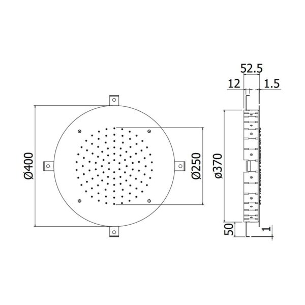Диаметр душевого диска составляет Ø400 мм, что обеспечивает широкую зону орошения и равномерное распределение воды. Ультратонкая конструкция (всего 1,5 мм) подчёркивает современный стиль и минимализм. Идеально подходит для потолочного монтажа, обеспечивая эстетичную интеграцию в интерьер ванной комнаты.