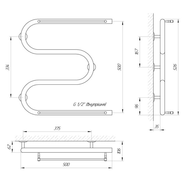 Комплектацыя | Полотенцесушитель — 1 шт, крепление (шуруп оцинкованный с дюбелем, пятак, втулка, штифт, стойка) — 3 шт, ключ шестигранный — 1 шт, упаковка (короб гофрокартонный, чехол полиэтиленовый, чехол полиэтиленовый для крепления, короб гофрокартонный для креплений) — 1 шт, паспорт — 1 шт. |